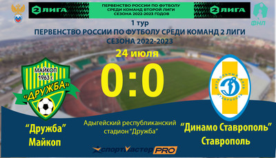 Сегодня состоялся матч 1-го тура Первенства России по футболу среди команд Второй Лиги сезона 2022-2023 годов. Соперником майкопской «Дружбы» были футболисты ФК «Динамо-Ставрополь ...