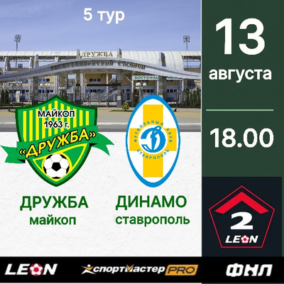 13 августа, республиканский стадион «Дружба». Играем со ставропольским «Динамо» матч 5-го тура LEON Второй Лиги Б. Приглашаем болельщиков поддержа ...