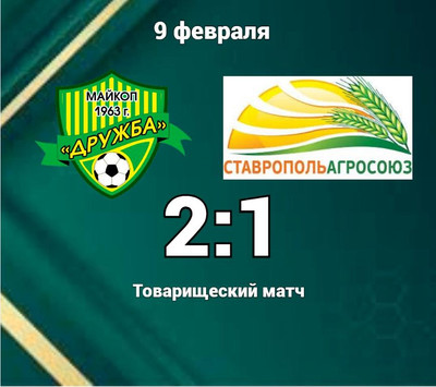 12 февраля «Дружба» проведет второй матч в рамках второго предсезонного сбора. ️ Соперник майкопчан – хорошо знакомый по группе 1 Второй лиги Б ... «Дружба» обыграла «СтавропольАгроСоюз» из Невинномысска