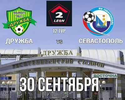 Приглашаем всех болельщиков на матч 12-го тура LEON Второй лиги Б, который состоится в Майкопе на главной спортивной арене республики. Начало матча в 16.00. ...30 сентября «Дружба» принимает на своём поле ФК «Севастополь»