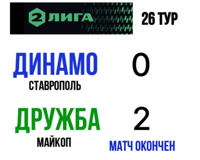 Майкопская «Дружба» одержала гостевую победу в заключительном туре Первенства России среди команд Второй лиги в Группе 1. Майкопчане забили два безотв ... 29 апреля майкопская «Дружба» играет в Ставрополе с местным «Динамо»