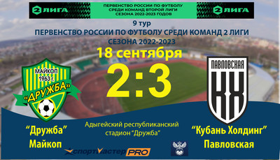 18 сентября состоится матч 9-го тура Первенства России по футболу среди команд Второй Лиги сезона 2022-2023 годов. Соперником майкопской «Дружбы» будут футбол ... Статья в газете "Советская Адыгея"