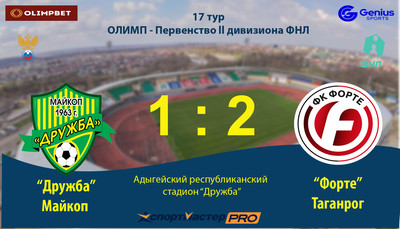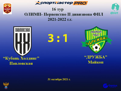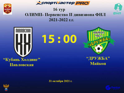 Матч 17-го тура Олимп-Первенство России II дивизиона ФНЛ сезона 2021-2022 годов. «Дружба» проведет в Майкопе на республиканском стадионе. Об ... Выездной матч «Дружба» проиграла в упорной борьбе